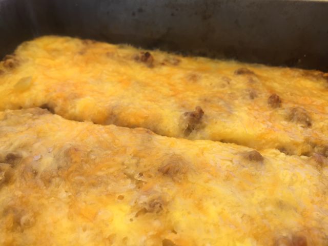 Sprinkle with the sausage and cheese.